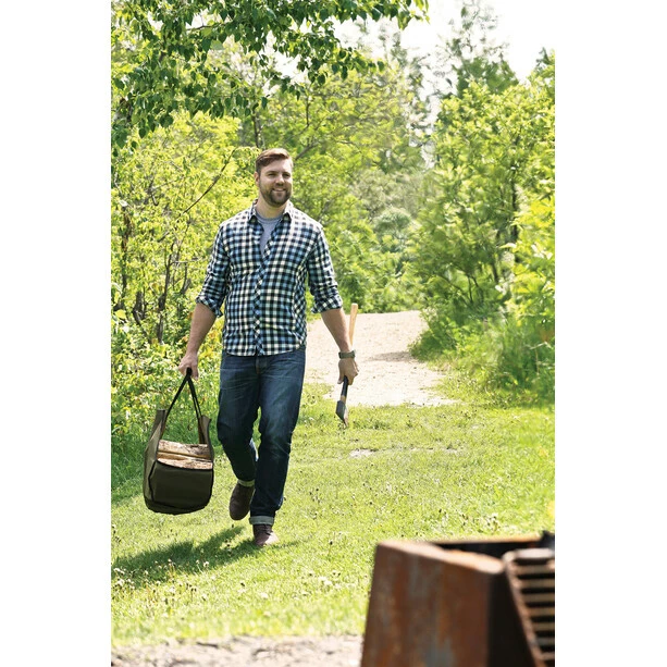 A large canvas sack for carrying firewood or other gear to your campsite. Made from durable cotton canvas and reinforced with polyester webbing straps. Great to use at campsite, home and garden. Strong handles fasten together with a hook and loop closure for easy carrying. Closed ends keep debris from falling out.